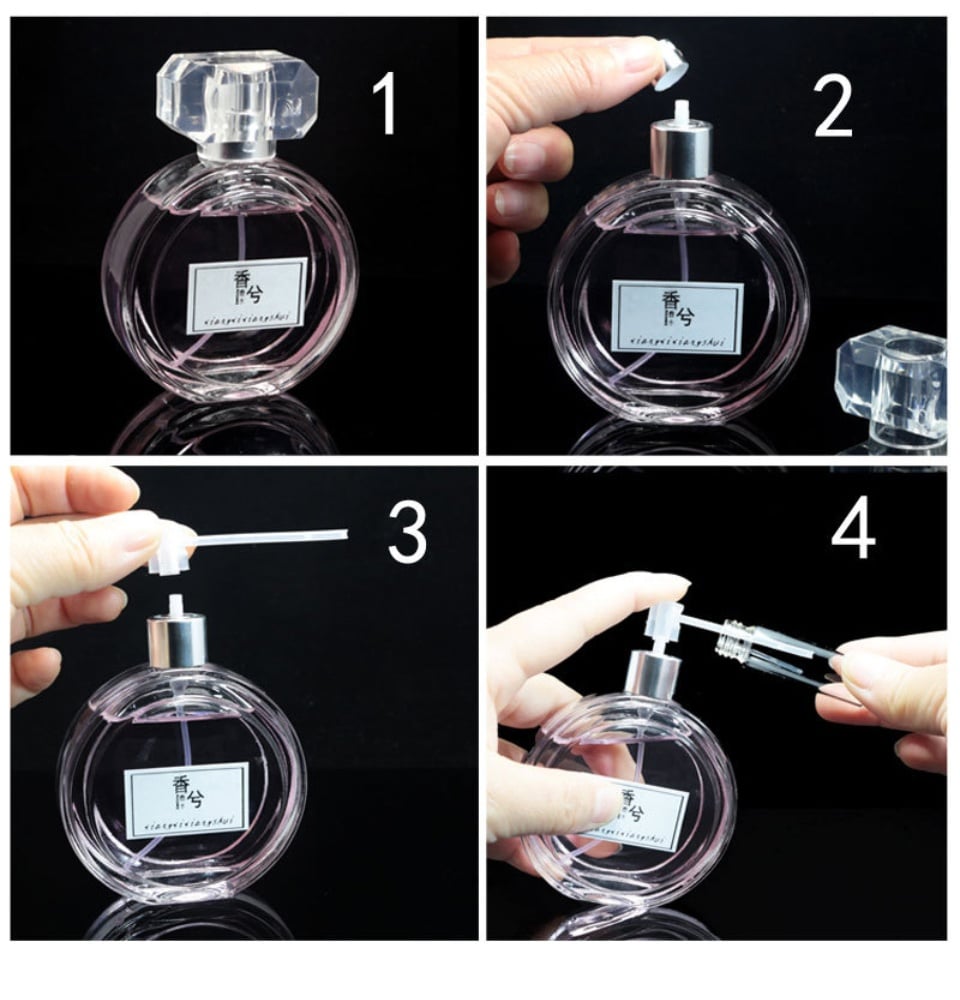 Thao tác rất đơn giản: Rút phần vòi xịt của chai nước hoa, sau đó đặt ống chiết cẩn thận và khéo léo để sát với miệng vòi xịt của chai nước hoa. Tiếp theo bạn cần nhấn ống chiết đều tay cho đến khi đầy theo dung tích bạn mong muốn.