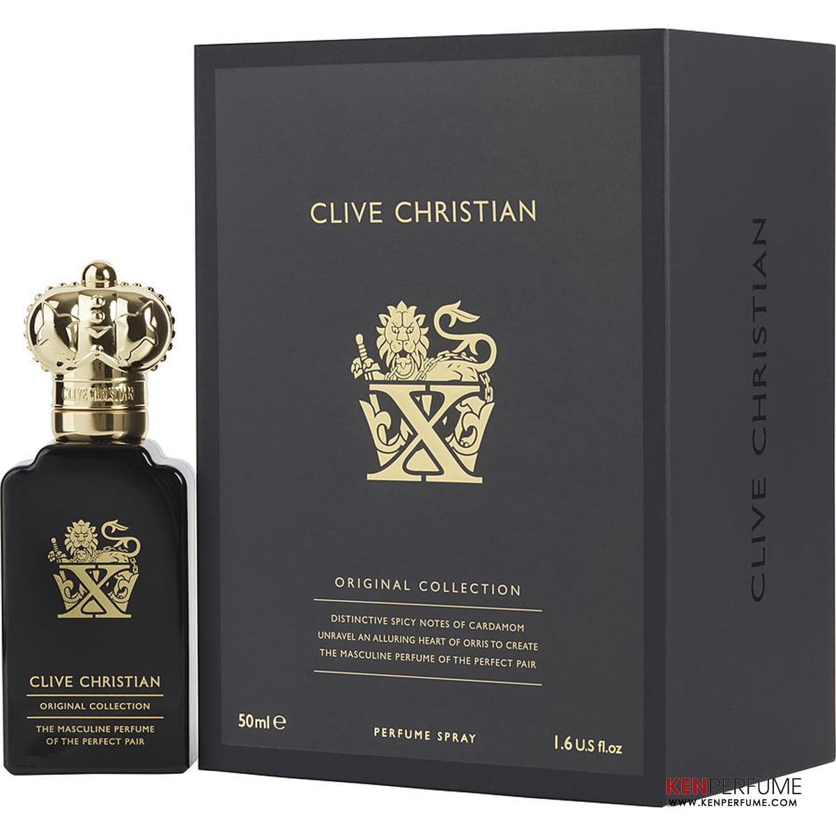 Chai nước hoa nguyên bản của nước hoa Clive Christian X Original Collection được thiết kế theo dạng hình trụ dài với màu đen huyền bí. Nắp chai được mạ vàng hình vương miện quý phái. Mùi hương uy nghiêm, vương giả và sang trọng, có thể nói cho đến nay ít mùi hương nào có thể trùng lặp được sự duyên dáng và khí phách mà X mang đến cho người hâm mộ. Ở châu Âu, Clive Christian X là dòng nước hoa dành riêng cho giới giàu và siêu giàu, pha trộn giữa gỗ tuyết tùng, chanh và quế để tạo ra mùi hương đậm đà, tuyệt vời làm choáng ngợp ngay cả những người sành điệu thanh đạm nhất.