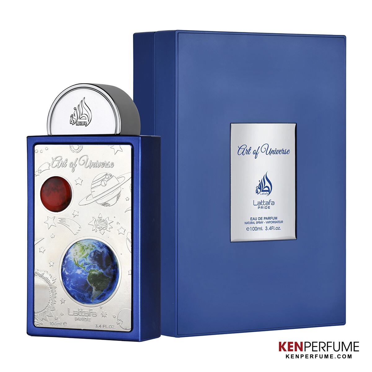 Không thể không nhắc đến thiết kế đỉnh chóp thị giác của Lattafa Art Of Universe. Hộp đựng vuông vức, phủ lớp màu xanh không gian huyền bí, kết hợp mặt trước là hình ảnh trái đất – sao – hành tinh khiến người ta liên tưởng đến một bảo vật thiên văn.