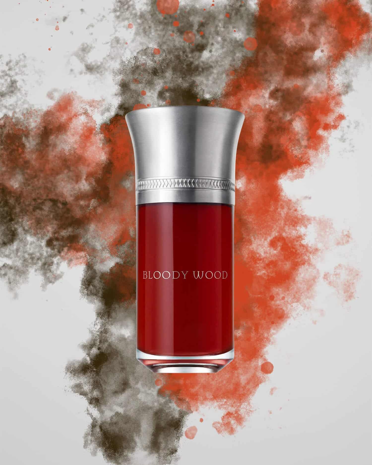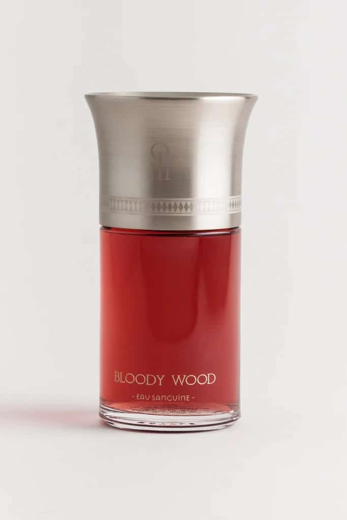 Les Liquides Imaginaires Bloody Wood được lấy cảm hứng từ đồ uống có cồn thần thánh. Giống như rượu vang, là một thập giá và thứ tốt nhất kiếm được nhờ bàn tay khéo léo của con người và sự nảy mầm của thiên nhiên. Chất lỏng và hình dạng của nước và chai có màu đỏ, mùi hương say đắm của gỗ và rượu bổ sung cho nhau. Dữ dội như một vết thương hay sự phản bội, màu đỏ nồng nàn như một loại nước hoa của chiến thắng và vinh quang.