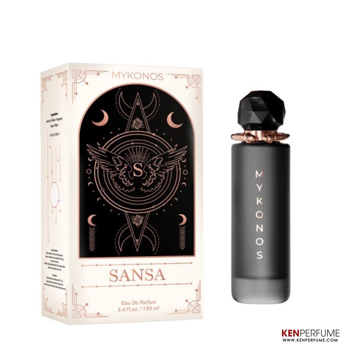 Mykonos Sansa EDP là một tác phẩm nghệ thuật mùi hương, mang đến trải nghiệm đa chiều và lôi cuốn: Tầng hương đầu: Bắt đầu bằng rêu, đào, trà đen, trà hoa mộc. Ấn tượng đầu tiên của Sansa khá mạnh mẽ và nồng nàn, dẫu đó chỉ là tổ hợp thanh dịu lãng đãng của trà đen, hoa mộc tê và trội nhất là mùi trái đào cùng thoang thoảng hương hoa. Tầng hương giữa: Trái tim của Sansa được xây dựng từ hoa hồng, hoa huệ, kẹo bơ cứng, tạo nên chiều sâu cảm xúc đầy mê hoặc. Tầng hương cuối: Khép lại với sự ấm áp của gỗ tuyết tùng, rễ diên vĩ, cỏ hương bài, socola đen, sự kết hợp tinh tế của hương gỗ và socola đen không chỉ nịnh mũi của bạn mà còn nịnh cả những người xung quanh bạn với sự dễ chịu mà nó mang lại.